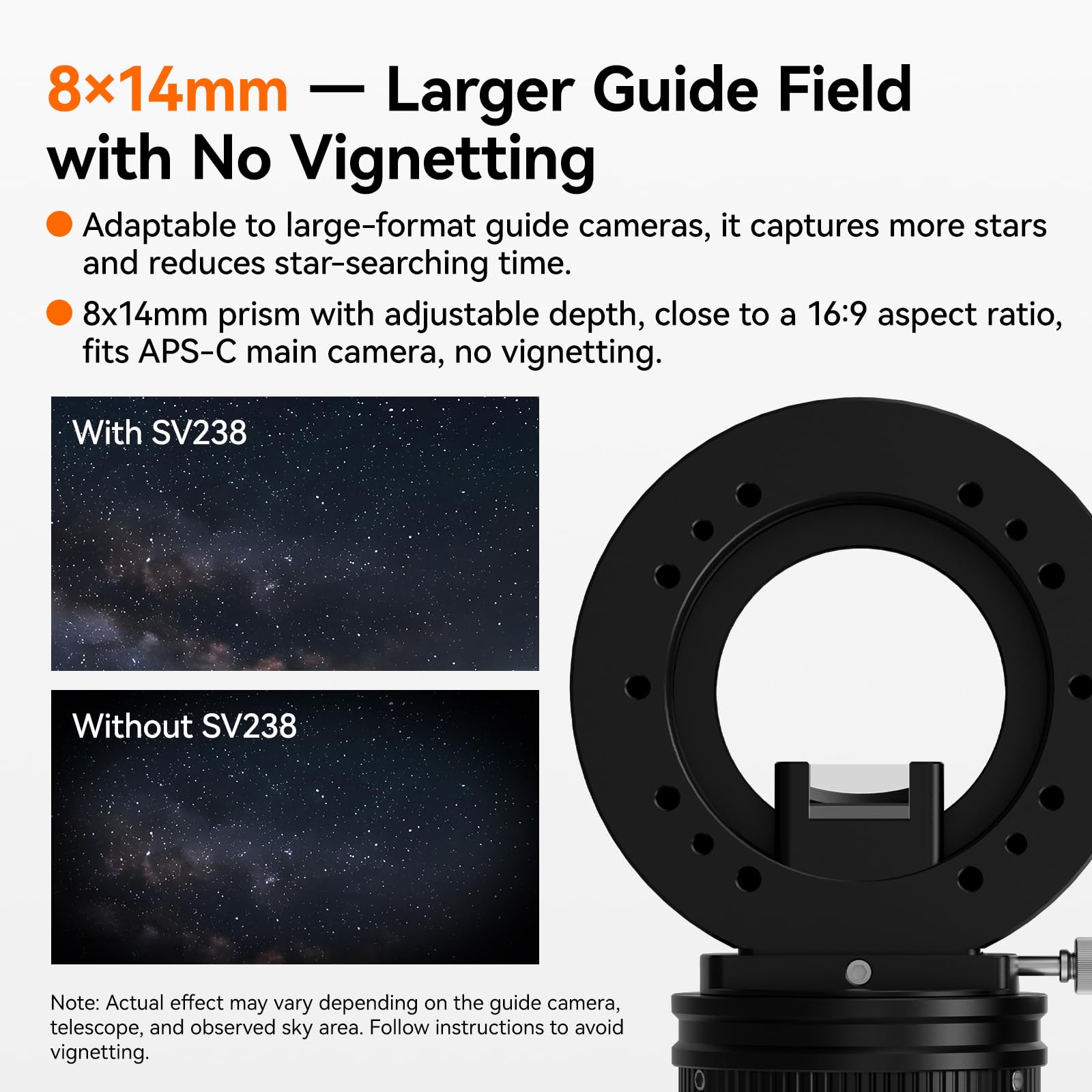 - Large Prism Height adjustable: SV238 Off-Axis Guider (OAG) 8x14mm Large Prism captures more starlight and provides a wider field of view; making it easier to find suitable guide stars even in sparse star fields; This ensures higher guiding success and stable performance; Features precise prism height adjustment; allowing flexible alignment