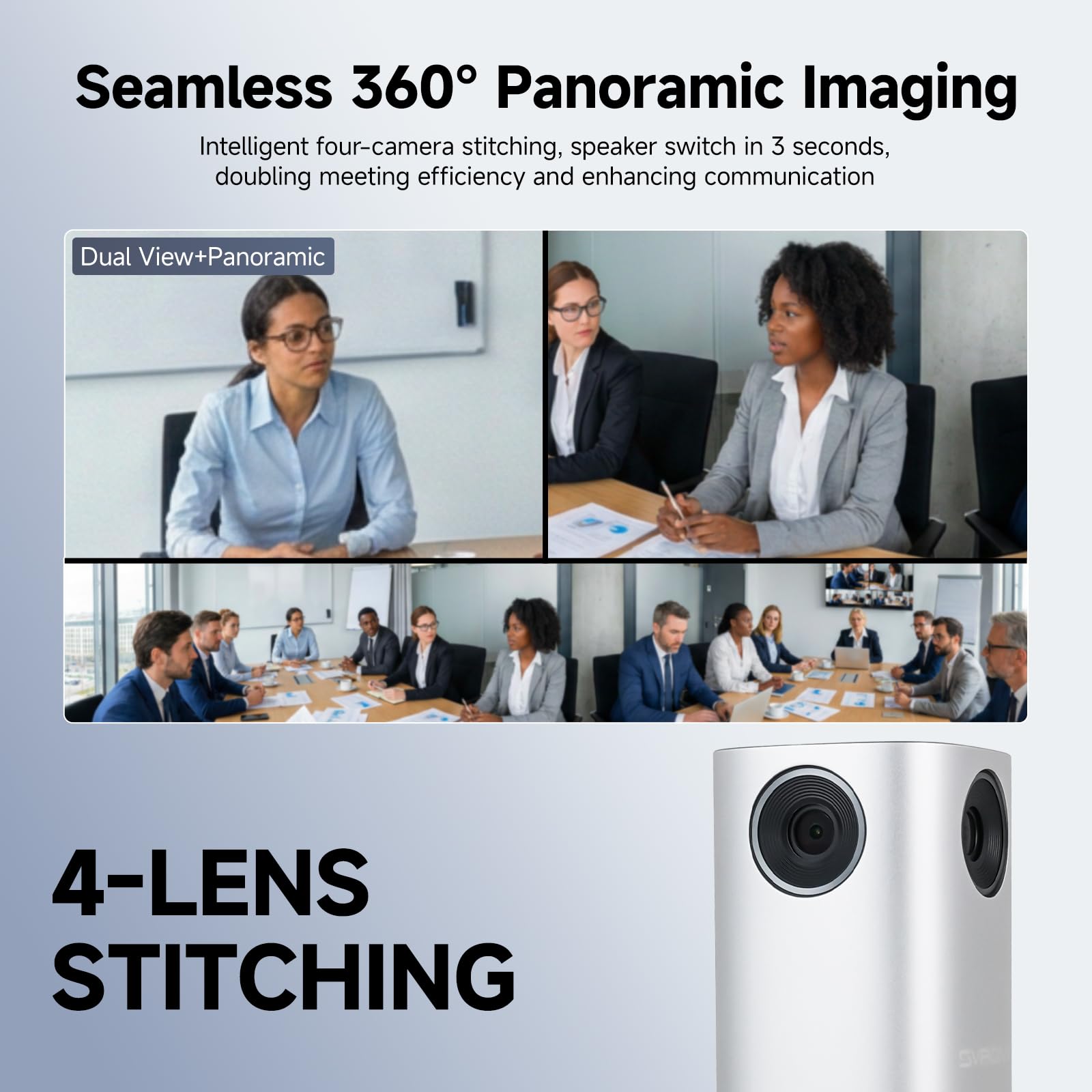 - Seamless 360° coverage: experience full-room coverage with this video conference room camera; Advanced 360° panoramic imaging combined with intelligent four-lens stitching creates seamless; immersive visuals; designed for hybrid work; ensuring every participant is clearly visible