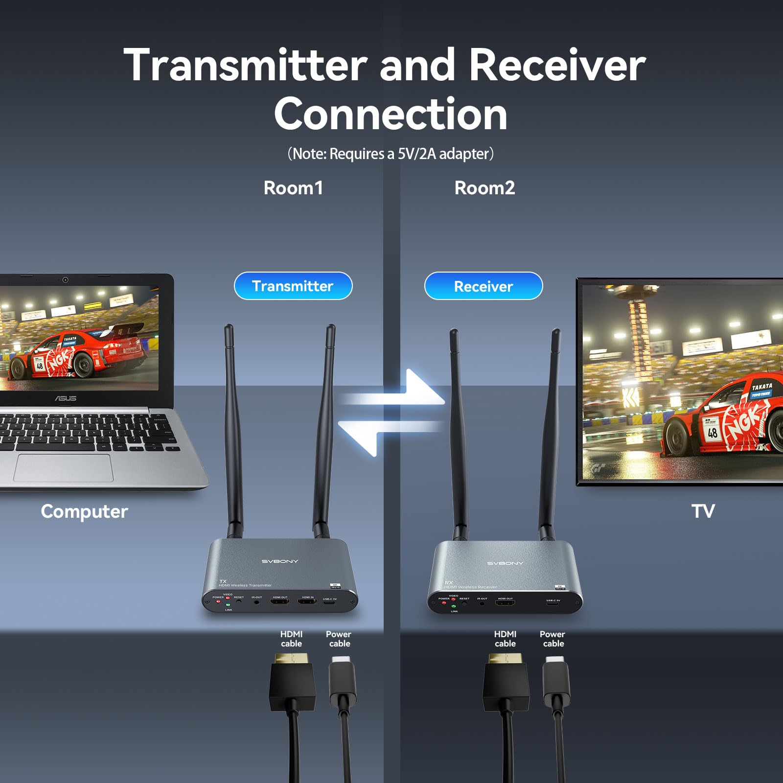 SVBONY TransAir2 Wireless HDMI Transmitter and Receiver 4K 30Hz, 5.8GHz, 1TX to 4 RXS, 1000 FT, HDMI Loop-Out, IR Extend, 0.06s Latency, 9 Channels, from PC, Laptop, STB to TV, Projector, Monitor—